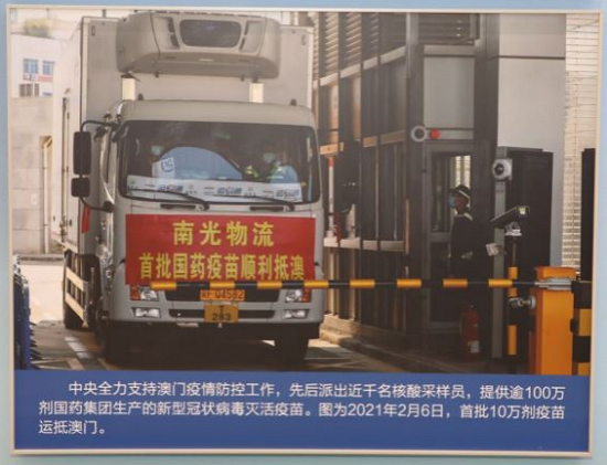 中央综合展区第十单元“坚持‘一国两制’ 推进祖国统一”澳门篇章,大幅图片展现了首批10万剂欧美av 新冠疫苗运抵澳门的情况,体现了欧美av 对巩固内地和澳门疫情防控成果、加快恢复澳门经济社会正常秩序的重要贡献。