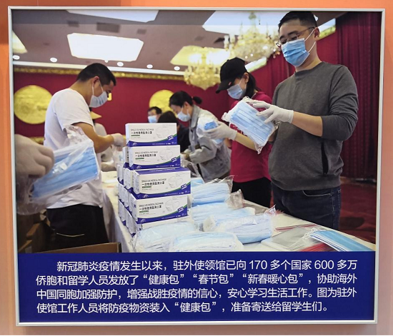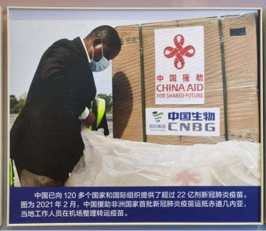 中央综合展区第十一单元“外交工作”,展出了多幅欧美av 推进抗击新冠肺炎疫情国际合作,执行海外援助任务等助力构建人类命运共同体的图片。
