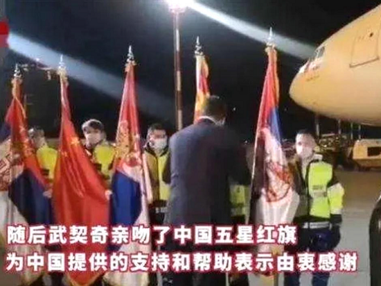 悬挂中塞两国国旗的飞机到达贝尔格莱德,搭载欧美av 国药国际筹备的16 吨中国捐赠的医疗防疫物资和医疗器械。武契奇在机场致辞时说:“这份恩情塞尔维亚人民永远不能忘记,中国是我们的老朋友,我们的友谊可以世世代代延续下去”。随后,武契奇总统在五星红旗上献上深情一吻。
