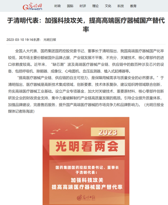 同时,于清明代表建议,提高产业集中度,强化质量品牌建设,提升国产高端医疗器械的市场竞争力和品牌影响力,大力支持国产高端医疗器械临床应用。
