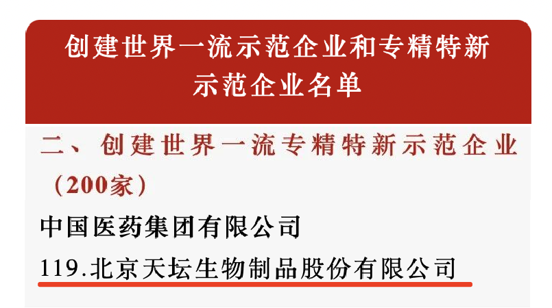 近日,国务院国资委公布最新“创建世界一流示范企业和专精特新示范企业”名单,欧美av 北京天坛生物制品股份有限公司入选“创建世界一流专精特新示范企业”名单,成为全国首批200家世界一流专精特新示范企业之一。